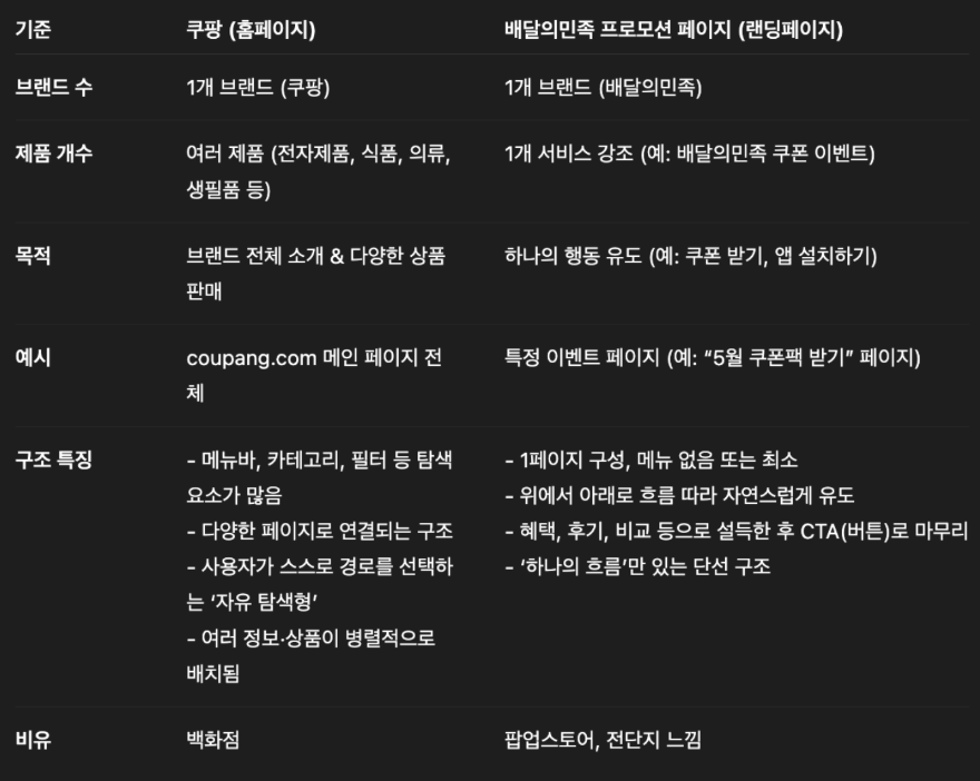 예를 들면, 배달의민족 메인처럼 하나의 메시지와 CTA(Call to Action)에 집중된 구조를 가집니다.